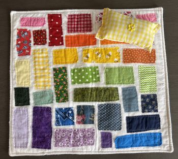 Hand sewn and quilted 16” x 19” blanket or table mat. Multi-colored with dark blue backing. This set can be used as a doll blanket and pillow, as a small pet blanket and kitty kicker toy or as a table mat and give the pillow to your favorite kitty to use as a kick toy!