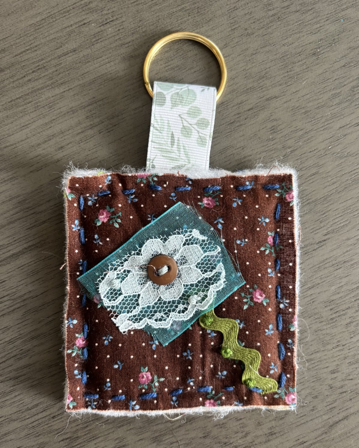 3.5" x 3.5" Quilted Key Ring. Dark brown with brown button and tan print backside. Use as a key ring, purse or backpack charm.