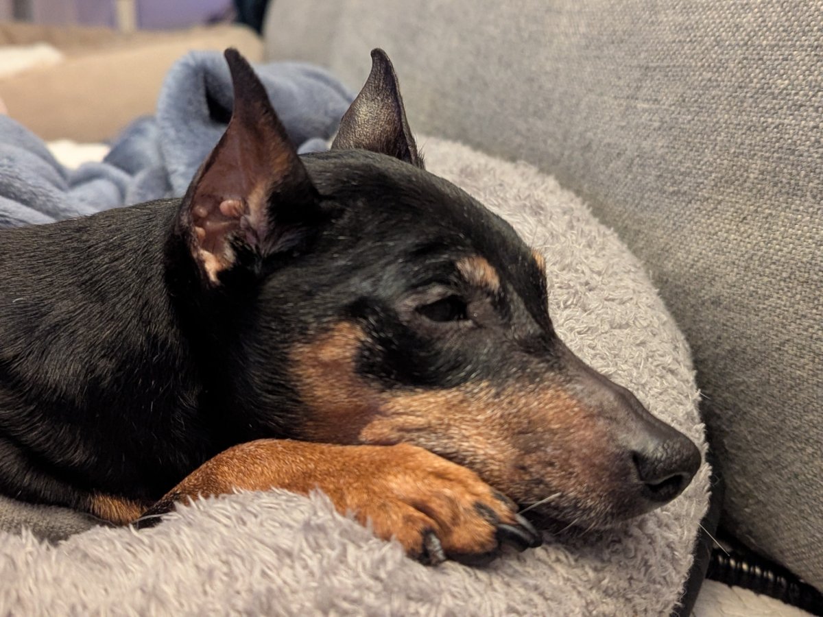 Elsbeth is a 14-year-old Miniature Pinscher with a heart full of love and a gentle spirit. With her shiny black coat and classic tan markings, she’s a petite beauty looking for a peaceful forever home.