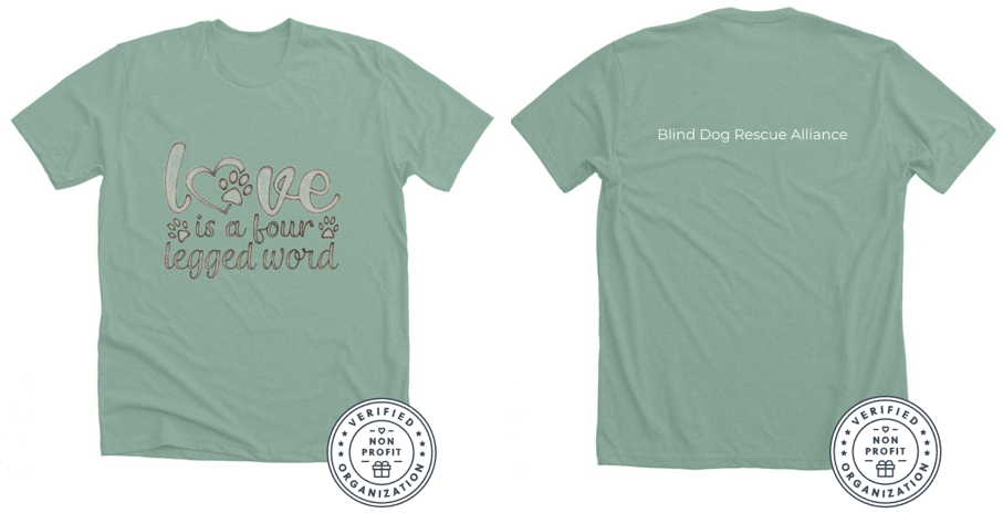 Show your passion for your pooches with this "Love is a four legged word" shirt. Blind Dog Rescue Alliance is printed on the back.