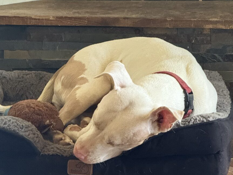 Hope is doing well, is walking good on a leash, loves going to the vet because everyone loves her there and she gets lots of pets. Hope likes to meet new people. She is really great about going to her kennel when asked. Easily goes into her kennel when her foster mom leaves. Hope loves to snuggle at night and likes to put her head in my lap when I’m reading. She likes to cuddle and sleeps right by her foster mother. She has a lot of energy, likes to play with toys, and run outside with her foster siblings of all sizes and breeds. Her favorite games are chase and tug a war.