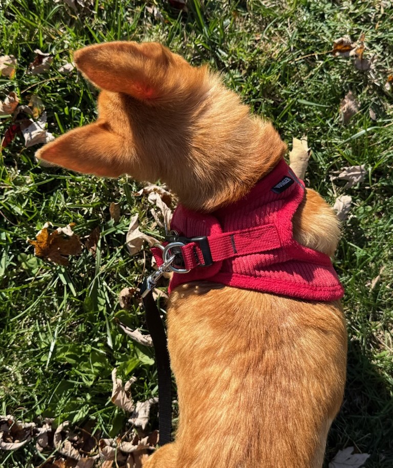 In early September, Johnny had a sudden onset of vestibular syndrome. For those interested in adopting Johnny and/or if you have questions about vestibular syndrome, speak with your vet. It is a relatively common condition. Johnny developed a head tilt to the left and began doing some circling to the left. He also had nystagmus (rapid eye movements). His appetite was not affected; he still loves to eat. The vet said Johnny has a mild case of vestibular syndrome and his symptoms have improved (the nystagmus has almost disappeared). He still has a left head tilt (slowly improving) and he still tends to walk in circles to the left, and this can make it challenging for him to walk on a leash. But recently he has just begun to turn his head to the right and walk to the right! The vet said in September he may have a lingering head tilt but he should not be circling as much as time passes. It is important to know that mild vestibular syndrome is not life-threatening.