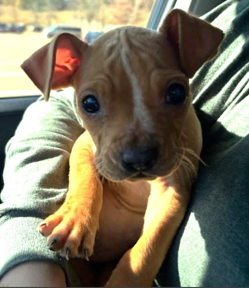 She is fantastic with the foster mom's two dogs ( although she is too young to really play and interact yet) and shows only gentle interest in cats. She has yet to meet a person she has not loved or a lap she does not want to be in.