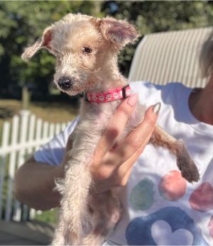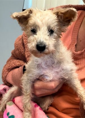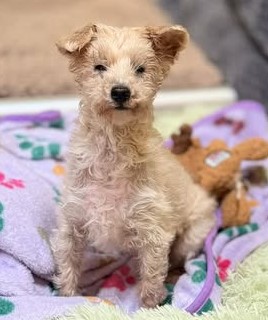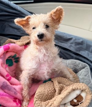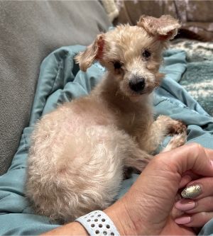 Lumi is a blind adult (estimated 5-8 year old) female poodle mix. She does have some genetic abnormalities which include her microphthalmia (tiny eyeballs) and only 3 toes per foot. She is so sweet and just learning how to be a dog- her favorite thing to do is to be close to her people and be snuggled and carried around- she likes riding in the stroller and being carried in the puppy sling. She is fine with other respectful dogs and kids and hasn't shown any aggression - though she does like to give playful nibbles on hands when she's excited and comfortable with her people.