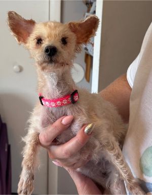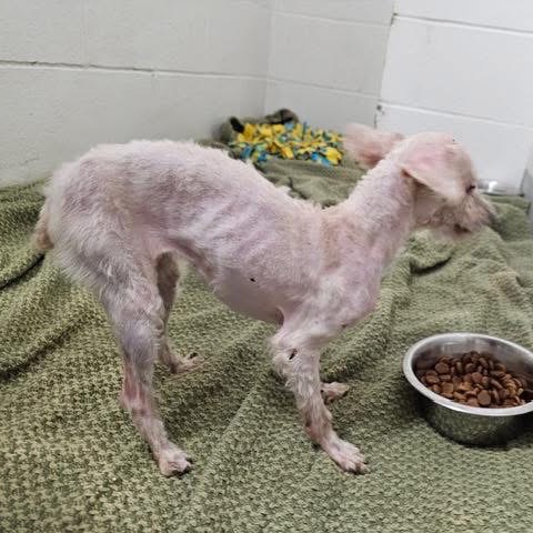 She was one of 10 little dogs that were found after their "owner" passed away- locked in cages, covered in filth and feces (Lumi was so matted she was immobile and had mold growing on her hair), with nothing to eat but some chicken food. They were starving to death- Lumi was only 2.9lbs at her initial intake and is now at a healthy weight of 4.6lbs.
