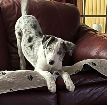 Wrangler is a sweet 4-month-old Husky/Catahoula Leopard Dog mix. His vision isn’t perfect, but he does have some sight. His eyes did not develop properly. But it doesn’t stop him from enjoying life to the fullest. He loves to play with other dogs and loves to cuddle with humans. He would do well in a home with other dogs to play with, and a fenced yard to run around in. Wrangler is a smart puppy and is learning commands quickly. He got a late start at potty training and learning commands but picking things up. He loves toys and nylabones to chew on. He also loves to chew on antlers and anything else hard.