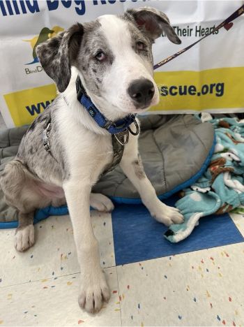 Wrangler does not like being left alone in a crate, so he has been sleeping with the other dogs and his foster Mom and doing well. He will sleep through the night with someone in bed. Wrangler will make a wonderful addition to a family and bring lots of laughs and joy and love. He is still growing so has plenty of time to learn so much and become a great dog for a loving family.