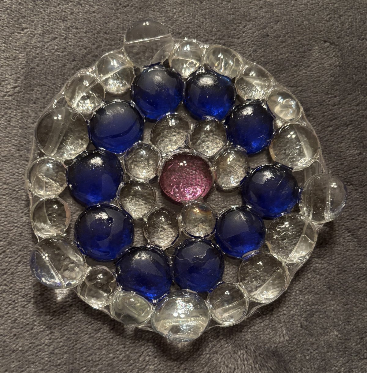 Clear and green stones with larger pink center stone, approximately 4" in diameter.